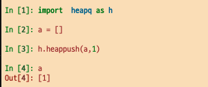 예를 들어 a라는 빈 배열에 heappush(a,1)이라고 하면 a에 1이라는 요소를 넣겠다는 의미이고, a를 출력하면 1이 추가된 리스트가 나오는 걸 확인할 수 있습니다.