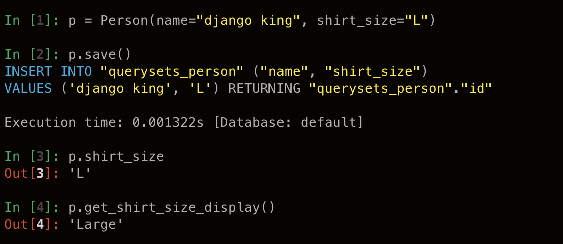 choices를 사용하는 이유는 내가 "S"를 선택하면 "Small"이 리턴되도록 설정하기 위함인데(쉽게 말해 딕셔너리의 key를 선택하면 value가 나와야 하는데), shirt_size로 접근하면 저장한 값이 나오지 choices에서 내가 선정한 그에 상응하는 값이 나오지 않는다는 것이죠.