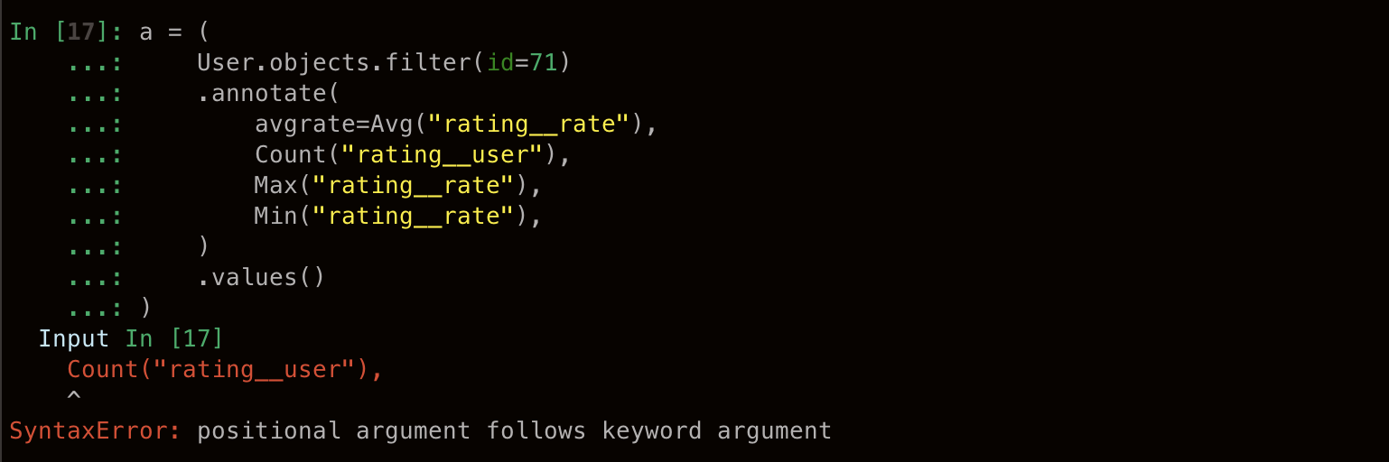마지막으로 annotate를 할 때, 첫 번째 케이스처럼 annotate 하나 안에서 다 선언할 경우 변수명을 설정해줄꺼면 다 설정해주던가 아니면 다 안해주던가 해야합니다. 안 해줄 경우 이렇게 에러가 발생하며, 다 해줄경우 내가 원하는 변수명으로 컬럼이 추가되어 나옵니다.