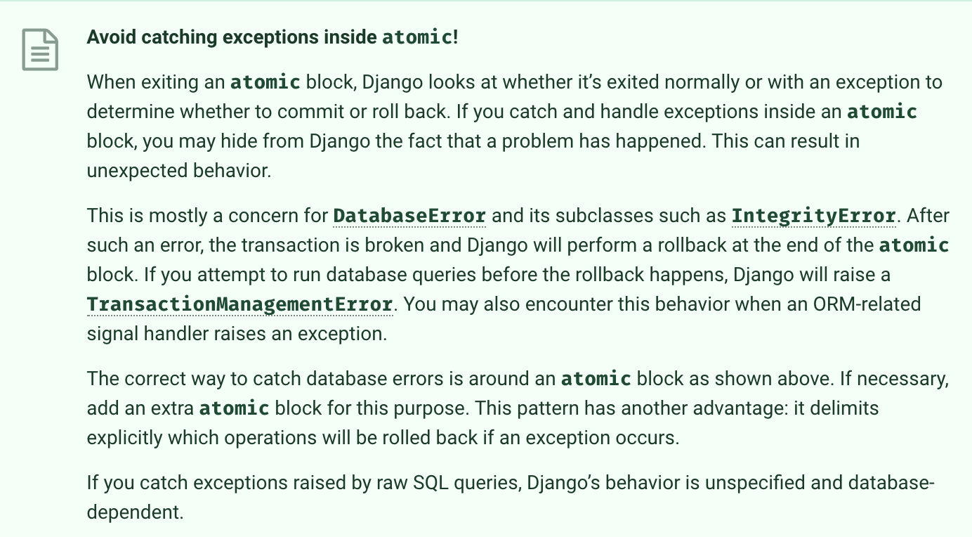 공식문서에 따르면 정상적으로 종료됐는지 파악하여 Commit, Rollback 중 액션을 정한다고 합니다. 그런데 transaction 내부에서 try-except를 설정해버린다면 문제가 발생했을 때 잡아내지 못 하는 경우가 발생하여 예기치 않은 동작까지 발생하게 됩니다. 그래서 오류를 잡는 올바른 방법은 transaction을 구간별로 걸어주는 걸 Django에서는 권장하고 있습니다.